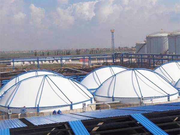 污水池加蓋主要分為固定式和移動(dòng)式的,固定式主要采用的是鋼支撐反吊膜結(jié)構(gòu),這個(gè)結(jié)構(gòu)具有很強(qiáng)的抗腐蝕性,它的材質(zhì)能把廢氣完全罩住。整體的鋼結(jié)構(gòu)在外面將膜體懸掛倒掉,這樣就能夠從根本上解決鋼結(jié)構(gòu)和膜體接觸產(chǎn)生的腐蝕性,整體的防腐級(jí)別就能夠得到很好的提升,至少能夠使用50年的壽命。而且膜材的自身重量非常輕,且具有很大的拉強(qiáng)力,能夠從根本上解決傳統(tǒng)建筑中沒辦法在大跨度中使用,特別適合于大面積的污水池。